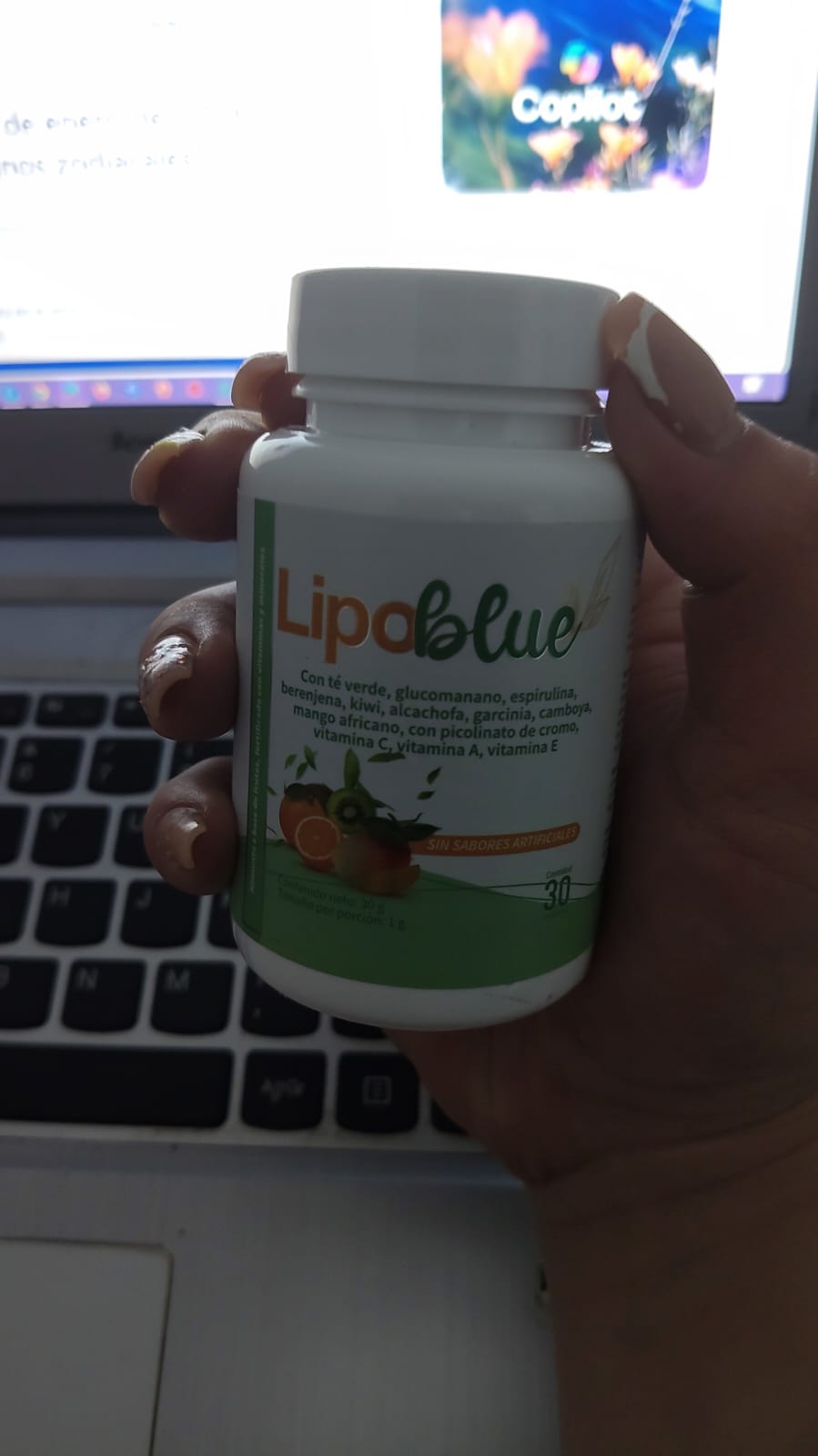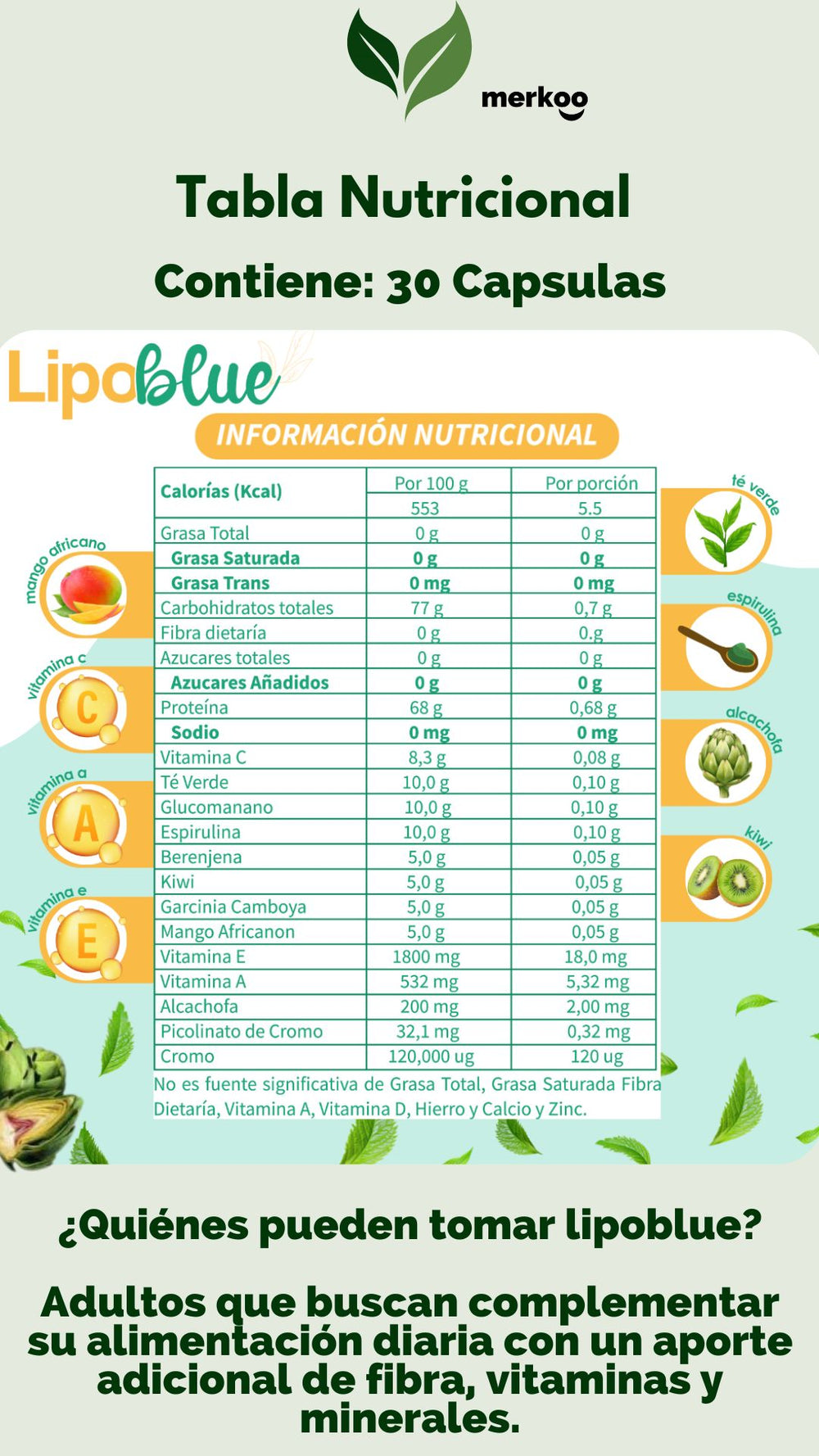 Lipoblue es un suplemento alimenticio diseñado para complementar tu rutina diaria con una combinación de ingredientes naturales que aportan fibra, vitaminas y minerales esenciales para el bienestar general.